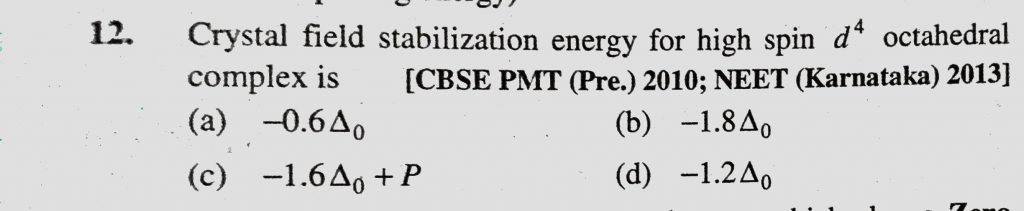 Crystal field stabilization energy for high spin d4 octahedral complex is (a) -0.6 delta 0 (b) -1.8 delta 0 Crystal field stabilization energy for high spin d4 octahedral complex is (a) -0.6 delta 0 (b) -1.8 delta 0 December 4, 2020 Category: Uncategorised (JEE Advanced Physics by BM Sharma + GMP Solutions) , Facebook Messenger WhatsApp Share this:TwitterFacebook Related