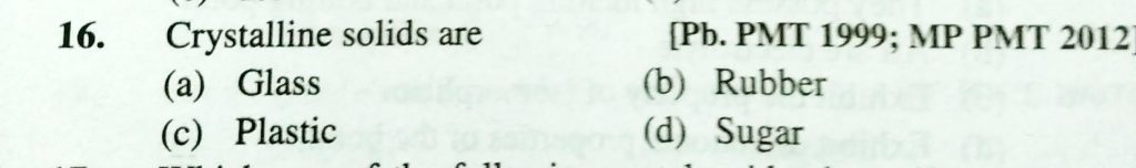 Crystalline solids are (a) Glass (b) Rubber (c) Plastic (d) sugar Crystalline solids are (a) Glass (b) Rubber (c) Plastic (d) Sugar February 8, 2021 Category: Uncategorised (JEE Advanced Physics by BM Sharma + GMP Solutions) , Facebook Messenger WhatsApp Share this:TwitterFacebook Related