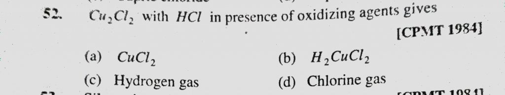 Cu2Cl2 with HCl in presence of oxidizing agents gives (a) CuCl2 (b) H2CuCl2 (c) Hydrogen gas Cu2Cl2 with HCl in presence of oxidizing agents gives (a) CuCl2 (b) H2CuCl2 (c) Hydrogen gas December 1, 2020 Category: Uncategorised (JEE Advanced Physics by BM Sharma + GMP Solutions) , Facebook Messenger WhatsApp Share this:TwitterFacebook Related