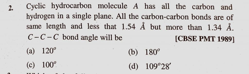 Cyclic hydrocarbon molecule A has all the carbon and hydrogen in a single plane. All the carbon – carbon bonds are of same length and less that 1.54 A but more than 1.34 A. C-C-C bond angle will be Cyclic hydrocarbon molecule A has all the carbon and hydrogen in a single plane. All the carbon - carbon bonds are of same length and less that 1.54 A but more than 1.34 A. C-C-C bond angle will be December 15, 2020 Category: Uncategorised (JEE Advanced Physics by BM Sharma + GMP Solutions) , Facebook Messenger WhatsApp Share this:TwitterFacebook Related