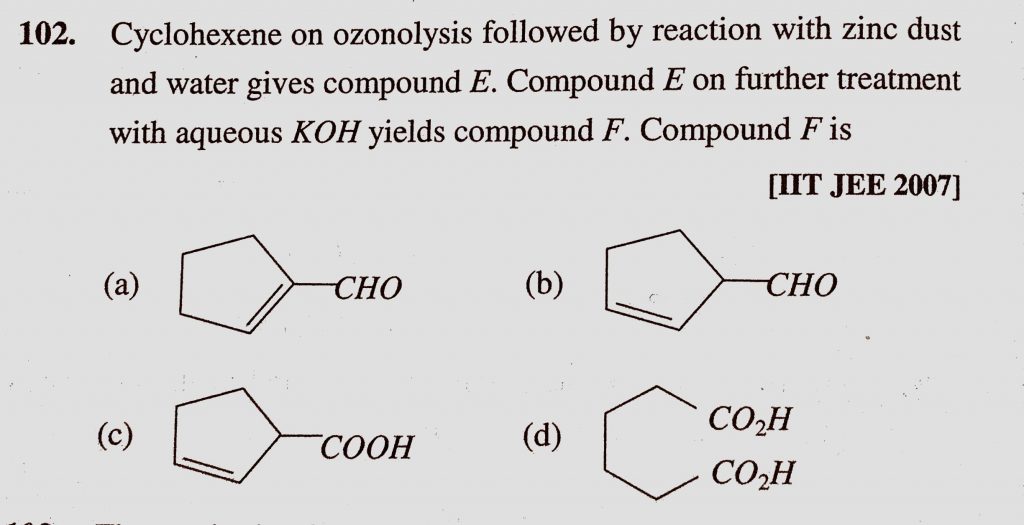 Cyclohexene on ozonolysis followed by reaction with zinc dust and water gives compound E. Compound E on further treatment with aqueous KOH yields compound F. Compound F is Cyclohexene on ozonolysis followed by reaction with zinc dust and water gives compound E. Compound E on further treatment with aqueous KOH yields compound F. Compound F is December 16, 2020 Category: Uncategorised (JEE Advanced Physics by BM Sharma + GMP Solutions) , Facebook Messenger WhatsApp Share this:TwitterFacebook Related