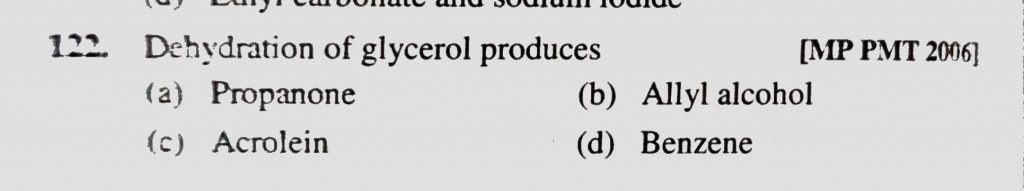 Dehydration of glycerol produces (a) Propanone (b) Allyl alcohol (c) Acrolein (d) Benzene Dehydration of glycerol produces (a) Propanone (b) Allyl alcohol (c) Acrolein (d) Benzene February 14, 2021 Category: Uncategorised (JEE Advanced Physics by BM Sharma + GMP Solutions) , Facebook Messenger WhatsApp Share this:TwitterFacebook Related