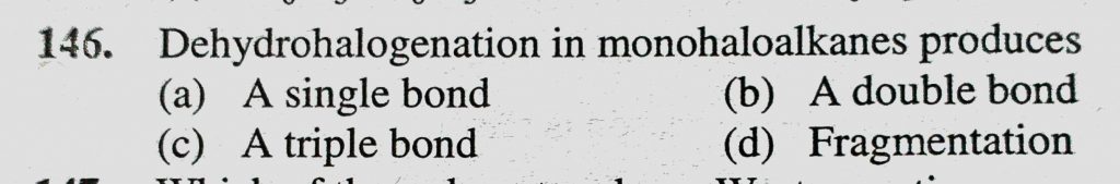 Dehydrohalogenation in monohaloalkanes produces (a) A single bond (b) A double bond (c) A triple bond (d) Fragmentation Dehydrohalogenation in monohaloalkanes produces (a) A single bond (b) A double bond (c) A triple bond (d) Fragmentation February 8, 2021 Category: Uncategorised (JEE Advanced Physics by BM Sharma + GMP Solutions) , Facebook Messenger WhatsApp Share this:TwitterFacebook Related