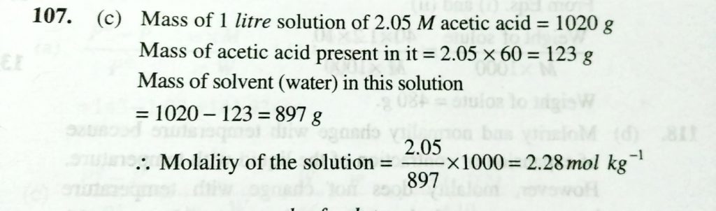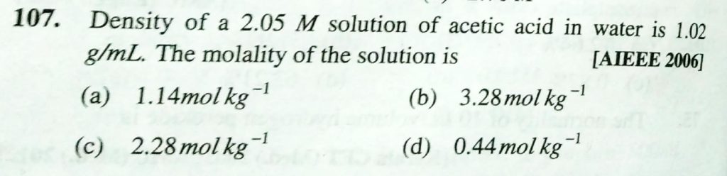 Density of a 2.05 M solution of acetic acid in water is 1.02 g/ml . THe molality of the solution is Density of a 2.05 M solution of acetic acid in water is 1.02 g/ml . THe molality of the solution is December 11, 2020 Category: Uncategorised (JEE Advanced Physics by BM Sharma + GMP Solutions) , Facebook Messenger WhatsApp Share this:TwitterFacebook Related