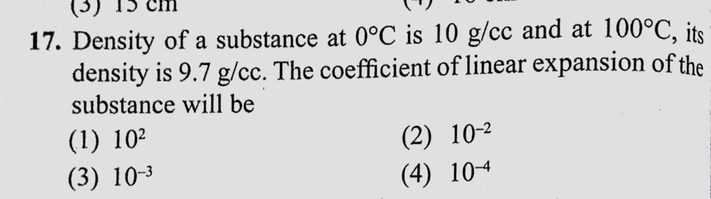 Density of a substance at 0 C is 10 g/cc and at 100 C, its density is 9.7 g/cc. The coefficient of linear expansion of the substance will be Density of a substance at 0 C is 10 g/cc and at 100 C its density is 9.7 g/cc. The coefficient of linear expansion of the substance will be October 23, 2020 Category: Uncategorised (JEE Advanced Physics by BM Sharma + GMP Solutions) , Facebook Messenger WhatsApp Share this:TwitterFacebook Related