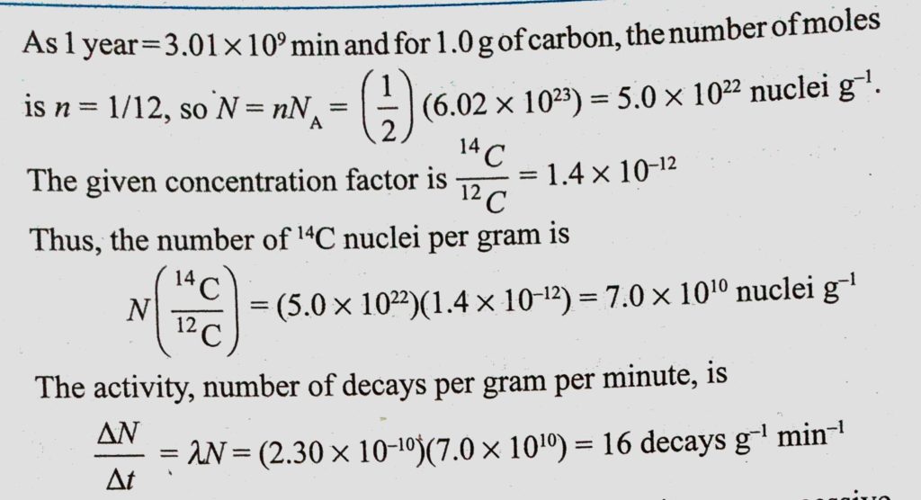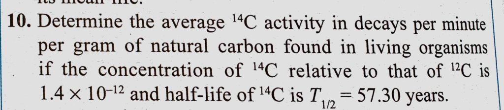 Determine the average 14C activity in decays per minute per gram of natural carbon found in living organisms if the concentration of 14C relative to that of 12C is 1.4 * 10^-12 and half-life Determine the average 14C activity in decays per minute per gram of natural carbon found in living organisms if the concentration of 14C relative to that of 12C is 1.4 * 10^-12 and half-life October 17, 2020 Category: Uncategorised (JEE Advanced Physics by BM Sharma + GMP Solutions) , Facebook Messenger WhatsApp Share this:TwitterFacebook Related