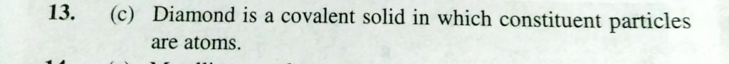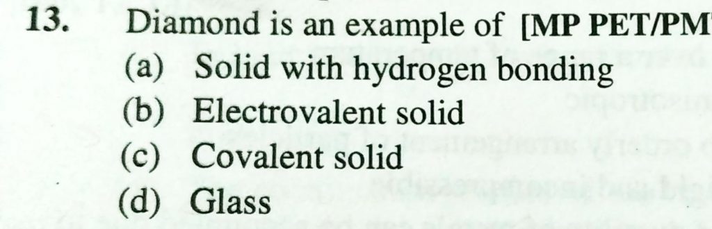 Diamond is an example of (a) Olid with hydrogen bonding (b) Electrovalent solid (c) Covalent solid (d) Glass Diamond is an example of (a) Olid with hydrogen bonding (b) Electrovalent solid (c) Covalent solid (d) Glass December 16, 2020 Category: Uncategorised (JEE Advanced Physics by BM Sharma + GMP Solutions) , Facebook Messenger WhatsApp Share this:TwitterFacebook Related