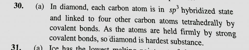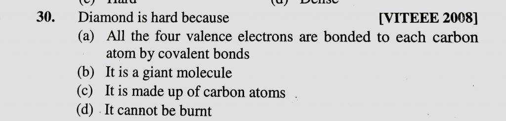Diamond is hard because (a) all the four valence electrons are bounded to each carbon atom by convalent bonds (b) It is giant molecule (c) It is made up of carbon atoms (d) It cannot be burnt Diamond is hard because (a) all the four valence electrons are bounded to each carbon atom by convalent bonds (b) It is giant molecule (c) It is made up of carbon atoms (d) It cannot be burnt February 8, 2021 Category: Uncategorised (JEE Advanced Physics by BM Sharma + GMP Solutions) , Facebook Messenger WhatsApp Share this:TwitterFacebook Related