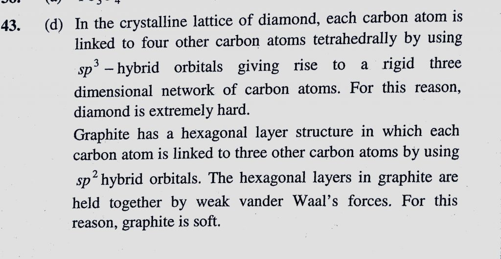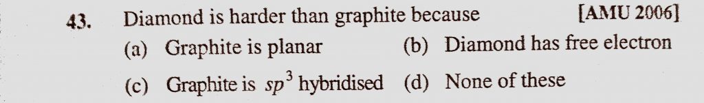 Diamond is harder than graphite because (a) Graphite is planer (b) Diamond has free electron (c) Graphite is sp3 hybridised Diamond is harder than graphite because (a) Graphite is planer (b) Diamond has free electron (c) Graphite is sp3 hybridised November 17, 2020 Category: Uncategorised (JEE Advanced Physics by BM Sharma + GMP Solutions) , Facebook Messenger WhatsApp Share this:TwitterFacebook Related