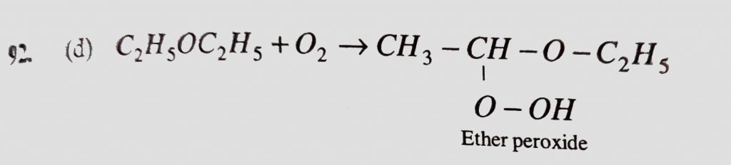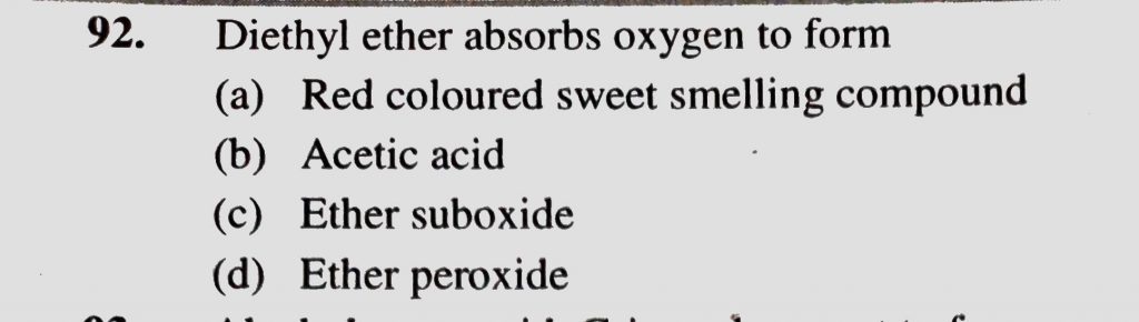 Diethyl ether absorbs oxygen to form (a) Red coloured sweet smelling compound (b) Acetic acid (c) Ether suboxide (d) Ether peroxide Diethyl ether absorbs oxygen to form (a) Red coloured sweet smelling compound (b) Acetic acid (c) Ether suboxide (d) Ether peroxide February 13, 2021 Category: Uncategorised (JEE Advanced Physics by BM Sharma + GMP Solutions) , Facebook Messenger WhatsApp Share this:TwitterFacebook Related