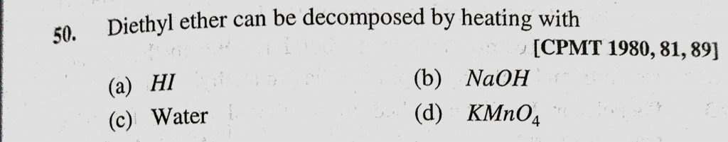 Diethyl ether can be decomposed by heating with (a) HI (b) NaOH (c) Water (d) KMnO4 Diethyl ether can be decomposed by heating with (a) HI (b) NaOH (c) Water (d) KMnO4 February 10, 2021 Category: Uncategorised (JEE Advanced Physics by BM Sharma + GMP Solutions) , Facebook Messenger WhatsApp Share this:TwitterFacebook Related