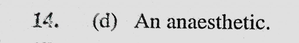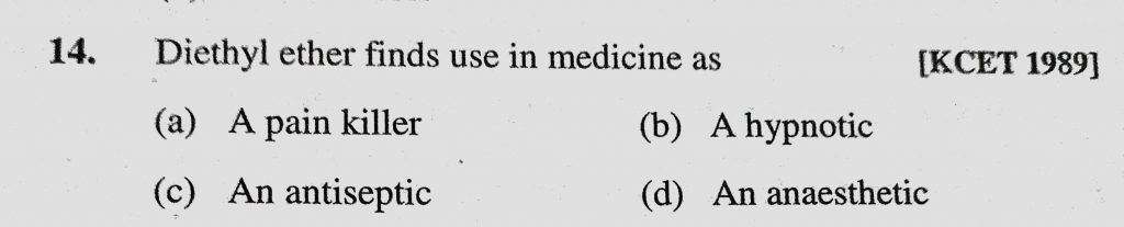 Diethyl ether finds use in medicine as (a) A pain killer (b) A hypnotic (c) An antiseptic (d) An anaesthetic Diethyl ether finds use in medicine as (a) A pain killer (b) A hypnotic (c) An antiseptic (d) An anaesthetic February 11, 2021 Category: Uncategorised (JEE Advanced Physics by BM Sharma + GMP Solutions) , Facebook Messenger WhatsApp Share this:TwitterFacebook Related