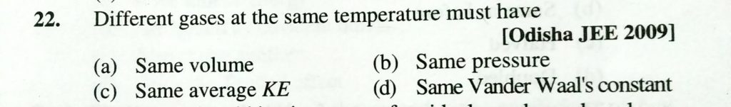 Different gases at the same temperature must have (a) Same volume (b) Same pressure (c) same average KE (d) same vander waal’s constant Different gases at the same temperature must have (a) Same volume (b) Same pressure (c) same average KE (d) same vander waal's constant February 11, 2021 Category: Uncategorised (JEE Advanced Physics by BM Sharma + GMP Solutions) , Facebook Messenger WhatsApp Share this:TwitterFacebook Related