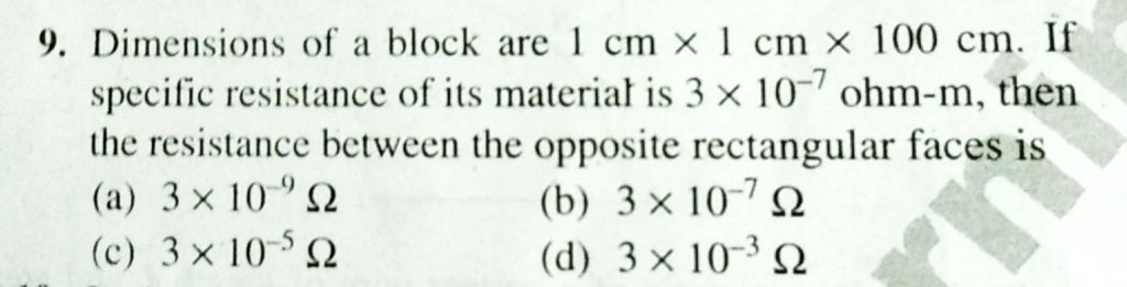 Dimensions of a block are 1 cm x 1cm x 100 cm. If specific resistance of its material is 3 x 10 ^-7 ohm -m, then the resistance between the opposite rectangular faces is Dimensions of a block are 1 cm x 1cm x 100 cm. If specific resistance of its material is 3 x 10 ^-7 ohm -m then the resistance between the opposite rectangular faces is September 19, 2020 Category: Uncategorised (JEE Advanced Physics by BM Sharma + GMP Solutions) , Facebook Messenger WhatsApp Share this:TwitterFacebook Related