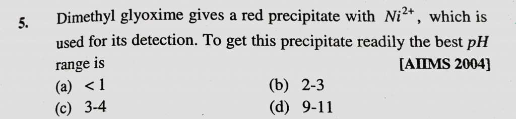 Dimethyl glyoxime gives a red precipitate with Ni 2+, Which is used for its detection. To get this precipitate readily the best pH range is (a) <1 (b) 2-3 Dimethyl glyoxime gives a red precipitate with Ni 2+ Which is used for its detection. To get this precipitate readily the best pH range is (a) <1 (b) 2-3 December 5, 2020 Category: Uncategorised (JEE Advanced Physics by BM Sharma + GMP Solutions) , Facebook Messenger WhatsApp Share this:TwitterFacebook Related