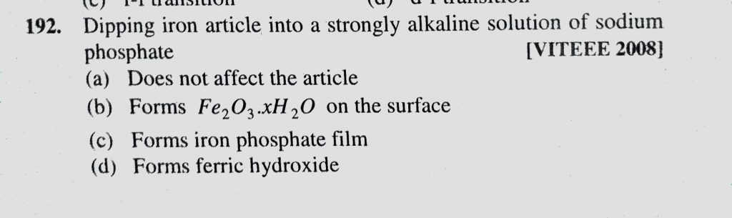 Dipping iron article into a strongly alkaline solution of sodium phosphate (a) Does not affect the article Dipping iron article into a strongly alkaline solution of sodium phosphate (a) Does not affect the article December 2, 2020 Category: Uncategorised (JEE Advanced Physics by BM Sharma + GMP Solutions) , Facebook Messenger WhatsApp Share this:TwitterFacebook Related