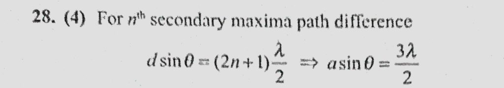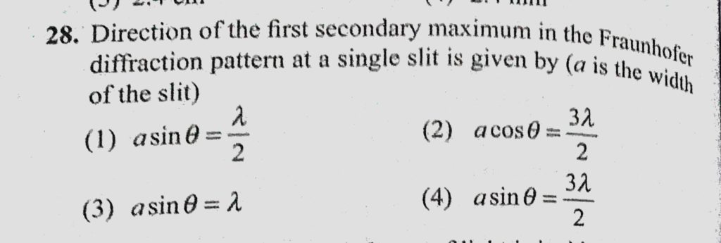Direction of the first secondary maximum in the Fraunhofer diffraction pattern at a single slit is given by (a is the width of the slit) Direction of the first secondary maximum in the Fraunhofer diffraction pattern at a single slit is given by (a is the width of the slit) October 12, 2020 Category: Uncategorised (JEE Advanced Physics by BM Sharma + GMP Solutions) , Facebook Messenger WhatsApp Share this:TwitterFacebook Related