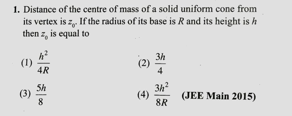 Distance of the centre of mass of a solid uniform cone from its vertex is Zo. If the radius of its base is R and its height is h then Zo is equal to Distance of the centre of mass of a solid uniform cone from its vertex is Zo. If the radius of its base is R and its height is h then Zo is equal to September 22, 2020 Category: Uncategorised (JEE Advanced Physics by BM Sharma + GMP Solutions) , Facebook Messenger WhatsApp Share this:TwitterFacebook Related