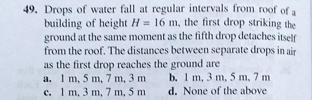 Drops of water fall at regular fall at regular intervals from roof of a building of height H = 16 m, the first drop striking the ground at the same moment as the fifth drop detaches itself Drops of water fall at regular fall at regular intervals from roof of a building of height H = 16 m the first drop striking the ground at the same moment as the fifth drop detaches itself September 19, 2020 Category: Uncategorised (JEE Advanced Physics by BM Sharma + GMP Solutions) , Facebook Messenger WhatsApp Share this:TwitterFacebook Related