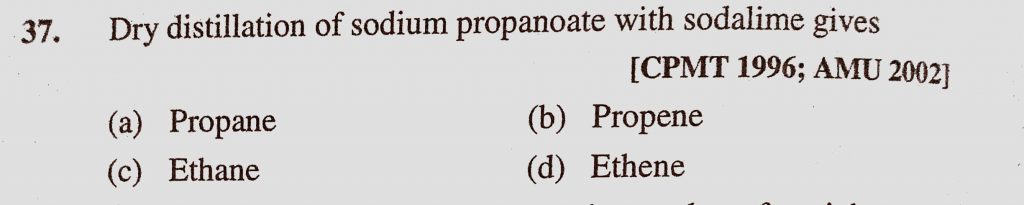 Dry distillation of sodium propanoate with sodalime gives (a) Propane (b) Propene (c) Ethane (d) Ethene Dry distillation of sodium propanoate with sodalime gives (a) Propane (b) Propene (c) Ethane (d) Ethene December 12, 2020 Category: Uncategorised (JEE Advanced Physics by BM Sharma + GMP Solutions) , Facebook Messenger WhatsApp Share this:TwitterFacebook Related