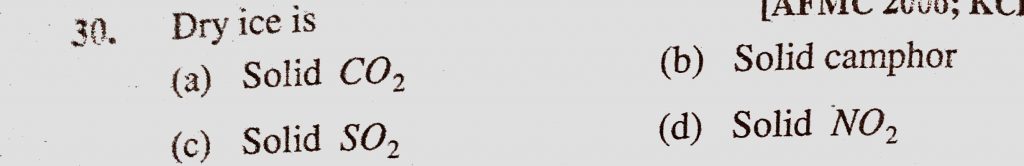 Dry ice is (a) Solid CO2 (b) Solid camphor (c) Solid SO2 (d) Solid NO2 Dry ice is (a) Solid CO2 (b) Solid camphor (c) Solid SO2 (d) Solid NO2 November 17, 2020 Category: Uncategorised (JEE Advanced Physics by BM Sharma + GMP Solutions) , Facebook Messenger WhatsApp Share this:TwitterFacebook Related