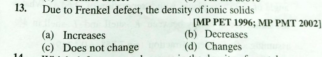 Due to Frenkel defect , the density of ionic solids (a) Increases (b) Decreases (c) Does not change (d) Changes Due to frenkel defect the density of ionic solids (a) Increases (b) Decreases (c) Does not change (d) Changes February 9, 2021 Category: Uncategorised (JEE Advanced Physics by BM Sharma + GMP Solutions) , Facebook Messenger WhatsApp Share this:TwitterFacebook Related