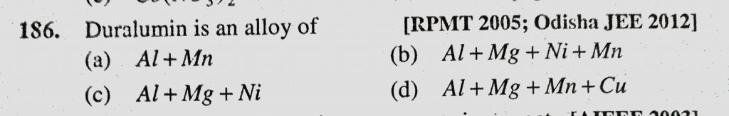 Duralumin is an alloy of (a) Al + Mn (b) Al + Mg + Ni + Mn (c) Al + Mg + Ni (d) Al + Mg + Mn + Cu Duralumin is an alloy of (a) Al + Mn (b) Al + Mg + Ni + Mn (c) Al + Mg + Ni (d) Al + Mg + Mn + Cu December 2, 2020 Category: Uncategorised (JEE Advanced Physics by BM Sharma + GMP Solutions) , Facebook Messenger WhatsApp Share this:TwitterFacebook Related