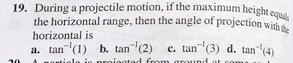 During a projectile motion, if the maximum height equals the horizontal range, then the angle of projection with the horizontal is During a projectile motion if the maximum height equals the horizontal range then the angle of projection with the horizontal is September 22, 2020 Category: Uncategorised (JEE Advanced Physics by BM Sharma + GMP Solutions) , Facebook Messenger WhatsApp Share this:TwitterFacebook Related