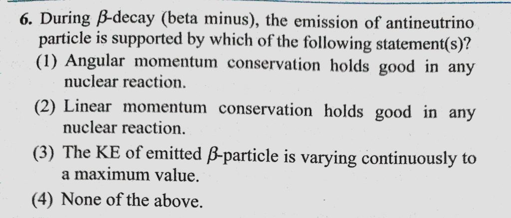 During beta decay (beta minus), the emission of antineutrino particle is supported by which of the following statement(s) ? During beta decay (beta minus) the emission of antineutrino particle is supported by which of the following statement(s) ? October 18, 2020 Category: Uncategorised (JEE Advanced Physics by BM Sharma + GMP Solutions) , Facebook Messenger WhatsApp Share this:TwitterFacebook Related