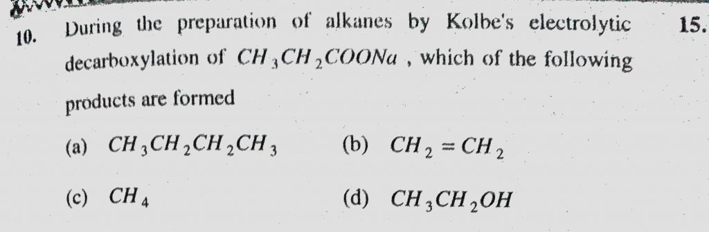 During the preparation of alkanes by Kolbe’s electrolytic decarboxylation of CH3CH2COONa, which of the following products are formed During the preparation of alkanes by Kolbe's electrolytic decarboxylation of CH3CH2COONa which of the following products are formed December 16, 2020 Category: Uncategorised (JEE Advanced Physics by BM Sharma + GMP Solutions) , Facebook Messenger WhatsApp Share this:TwitterFacebook Related