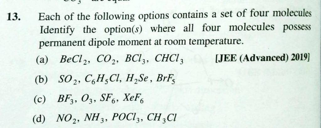 Each of the following options contains a set of four molecules Identify the option(s) where all four molecules posses permanent dipole moment at room temperature . Each of the following options contains a set of four molecules Identify the option(s) where all four molecules posses permanent dipole moment at room temperature . December 10, 2020 Category: Uncategorised (JEE Advanced Physics by BM Sharma + GMP Solutions) , Facebook Messenger WhatsApp Share this:TwitterFacebook Related