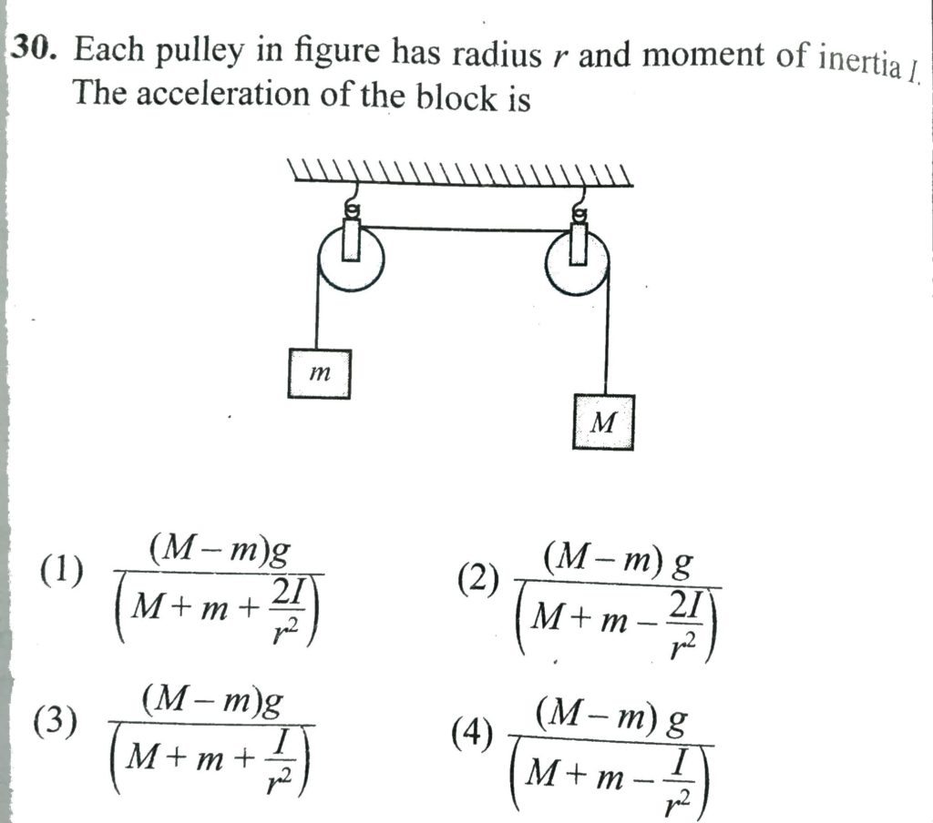 Each pulley in figure has radius r and moment of interia I. The acceleration of the block is Each pulley in figure has radius r and moment of interia I. The acceleration of the block is September 26, 2020 Category: Uncategorised (JEE Advanced Physics by BM Sharma + GMP Solutions) , Facebook Messenger WhatsApp Share this:TwitterFacebook Related