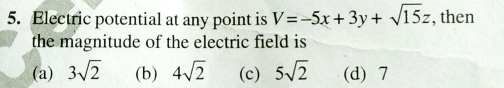 Electric potential at any point is V =-5x +3y +root 15z, then the magnitude of the electric field is Electric potential at any point is V =-5x +3y +root 15z then the magnitude of the electric field is September 17, 2020 Category: Uncategorised (JEE Advanced Physics by BM Sharma + GMP Solutions) , Facebook Messenger WhatsApp Share this:TwitterFacebook Related