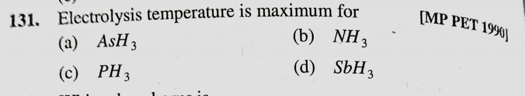 Electrolysis temperature is maximum for (a) AsH3 (b) NH3 (c) PH3 (d) SbH3 Electrolysis temperature is maximum for (a) AsH3 (b) NH3 (c) PH3 (d) SbH3 November 23, 2020 Category: Uncategorised (JEE Advanced Physics by BM Sharma + GMP Solutions) , Facebook Messenger WhatsApp Share this:TwitterFacebook Related