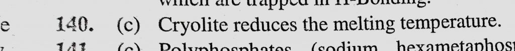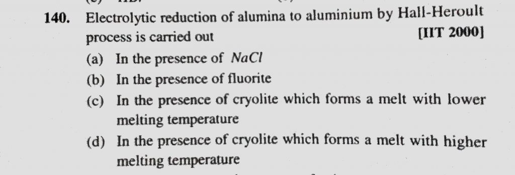 Electrolytic reduction of alumina to aluminium by Hall-Heroult process is carried out (a) In the presence of NaCl (b) In the presence of fluorine Electrolytic reduction of alumina to aluminium by Hall-Heroult process is carried out (a) In the presence of NaCl (b) In the presence of fluorine November 27, 2020 Category: Uncategorised (JEE Advanced Physics by BM Sharma + GMP Solutions) , Facebook Messenger WhatsApp Share this:TwitterFacebook Related