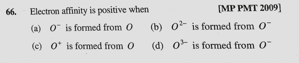 Electron affinity is positive when (a) O- is formed from O (b) O2- is formed from O- (c) O+ is formed from O (d) O3- is formed from O- Electron affinity is positive when (a) O- is formed from O (b) O2- is formed from O- (c) O+ is formed from O (d) O3- is formed from O- November 23, 2020 Category: Uncategorised (JEE Advanced Physics by BM Sharma + GMP Solutions) , Facebook Messenger WhatsApp Share this:TwitterFacebook Related