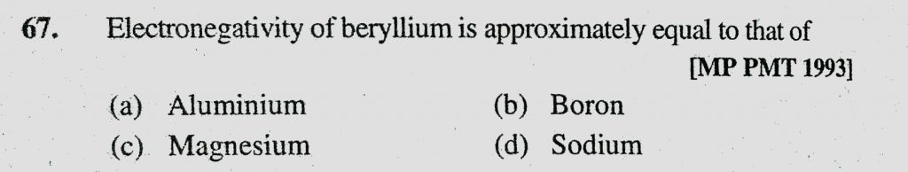 Electronegativity of beryllium is approximately equal to that of (a) Aluminium (b) Boron (c) Magnesium (d) Sodium Electronegativity of beryllium is approximately equal to that of (a) Aluminium (b) Boron (c) Magnesium (d) Sodium November 15, 2020 Category: Uncategorised (JEE Advanced Physics by BM Sharma + GMP Solutions) , Facebook Messenger WhatsApp Share this:TwitterFacebook Related