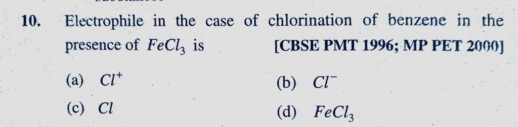 Electrophile in the case of chlorination of benzene in the presence of FeCl3 is (a) Cl+ (b) Cl- (c) Cl (d) FeCl3 Electrophile in the case of chlorination of benzene in the presence of FeCl3 is (a) Cl+ (b) Cl- (c) Cl (d) FeCl3 December 15, 2020 Category: Uncategorised (JEE Advanced Physics by BM Sharma + GMP Solutions) , Facebook Messenger WhatsApp Share this:TwitterFacebook Related