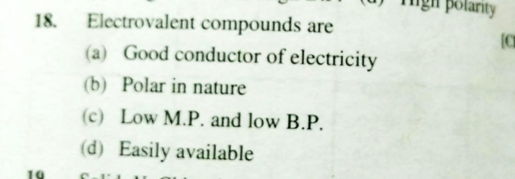 Electrovalent Compounds are (a) Good conductor of electricity (b) polar in nature (c) Low M.P and low B.P. (d) Easily available Electrovalent Compounds are (a) Good conductor of electricity (b) polar in nature (c) Low M.P and low B.P. (d) Easily available December 1, 2020 Category: Uncategorised (JEE Advanced Physics by BM Sharma + GMP Solutions) , Facebook Messenger WhatsApp Share this:TwitterFacebook Related
