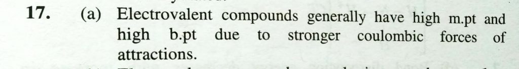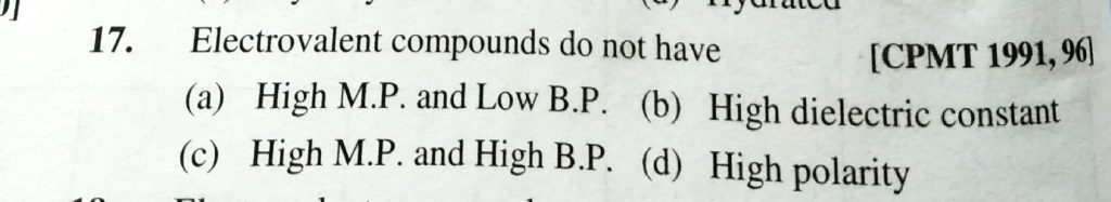 Electrovalent compounds do not have (a) HIgh M.P and Low B.P. (b) High dielectric constant (c) High M.P. and High B.P. (d) High polarity Electrovalent compounds do not have (a) HIgh M.P and Low B.P. (b) High dielectric constant (c) High M.P. and High B.P. (d) High polarity December 1, 2020 Category: Uncategorised (JEE Advanced Physics by BM Sharma + GMP Solutions) , Facebook Messenger WhatsApp Share this:TwitterFacebook Related