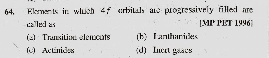 Elements in which 4f orbitals are progressively filled are called as (a) Transition elements (b) Lanthanides (c) Actinides (d) Inert gases Elements in which 4f orbitals are progressively filled are called as (a) Transition elements (b) Lanthanides (c) Actinides (d) Inert gases November 8, 2020 Category: Uncategorised (JEE Advanced Physics by BM Sharma + GMP Solutions) , Facebook Messenger WhatsApp Share this:TwitterFacebook Related