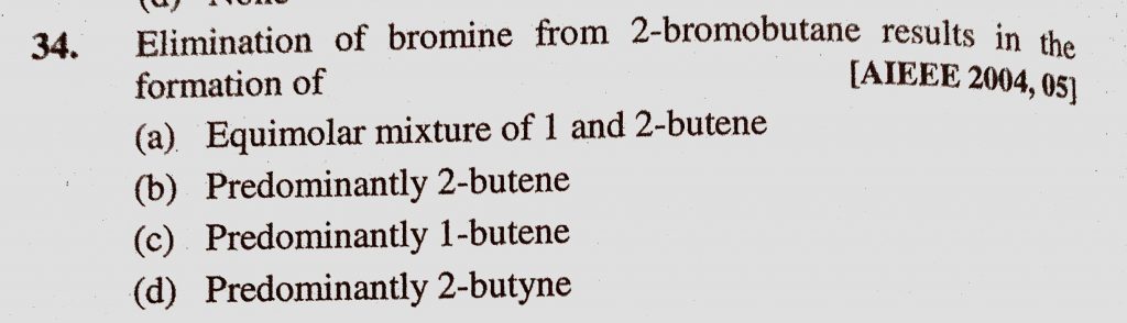 Elimination of bromine from 2-bromobutane results in the formation of (a) Equimolar mixture of 1 and 2-butene (b) Predominantly 2-butene Elimination of bromine from 2-bromobutane results in the formation of (a) Equimolar mixture of 1 and 2-butene (b) Predominantly 2-butene December 9, 2020 Category: Uncategorised (JEE Advanced Physics by BM Sharma + GMP Solutions) , Facebook Messenger WhatsApp Share this:TwitterFacebook Related