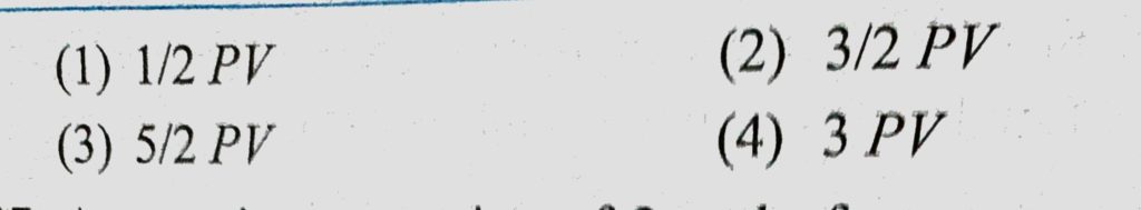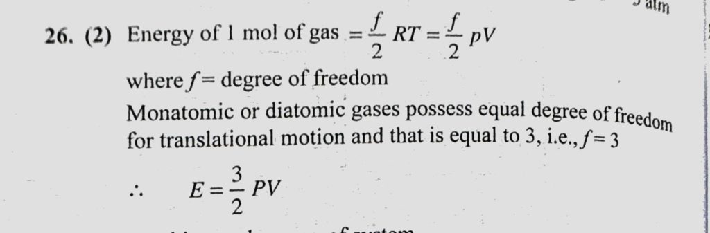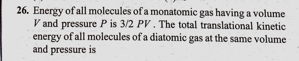 Energy of all molecules of a monoatomic gas having a volume V and pressure P is 3/2 PV. The total translational kinetic energy of all molecules of a diatomic gas at the same volume Energy of all molecules of a monoatomic gas having a volume V and pressure P is 3/2 PV. The total translational kinetic energy of all molecules of a diatomic gas at the same volume October 27, 2020 Category: Uncategorised (JEE Advanced Physics by BM Sharma + GMP Solutions) , Facebook Messenger WhatsApp Share this:TwitterFacebook Related