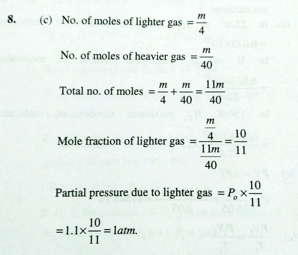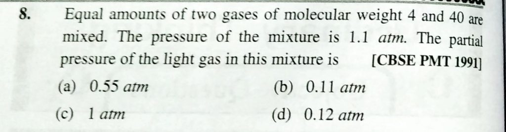 Equal amounts of two gases of molecular weight 4 and 40 are mixed . The pressure of the mixture is 1.1 atm. THe partial pressure of the light gas in this mixture is Equal amounts of two gases of molecular weight 4 and 40 are mixed . The pressure of the mixture is 1.1 atm. THe partial pressure of the light gas in this mixture is February 10, 2021 Category: Uncategorised (JEE Advanced Physics by BM Sharma + GMP Solutions) , Facebook Messenger WhatsApp Share this:TwitterFacebook Related