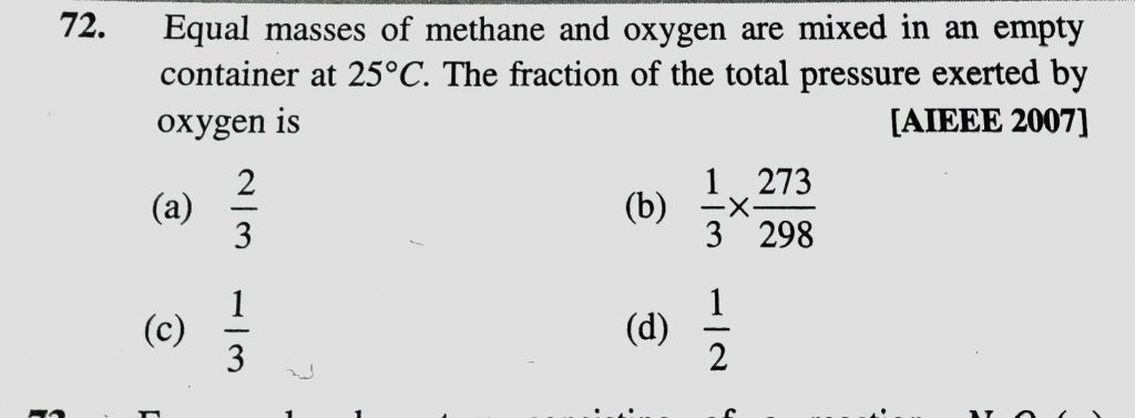 Equal masses of methane and oxygen are mixed in an empty container at 25 degree C . The fraction of the total pressure exerted by oxygen is Equal masses of methane and oxygen are mixed in an empty container at 25 degree C . The fraction of the total pressure exerted by oxygen is February 11, 2021 Category: Uncategorised (JEE Advanced Physics by BM Sharma + GMP Solutions) , Facebook Messenger WhatsApp Share this:TwitterFacebook Related