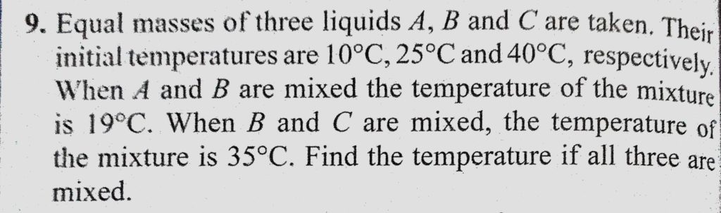 Equal masses of three liquids A, B and C are taken. Their initial temperatures are 10 c, 25 C and 40 C, respectively. When A and B are mixed the temperature of the mixture is 19 C. 25 C and 40 C B and C are taken. Their initial temperatures are 10 c Equal masses of three liquids A respectively. When A and B are mixed the temperature of the mixture is 19 C. October 23, 2020 Category: Uncategorised (JEE Advanced Physics by BM Sharma + GMP Solutions) , Facebook Messenger WhatsApp Share this:TwitterFacebook Related