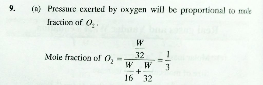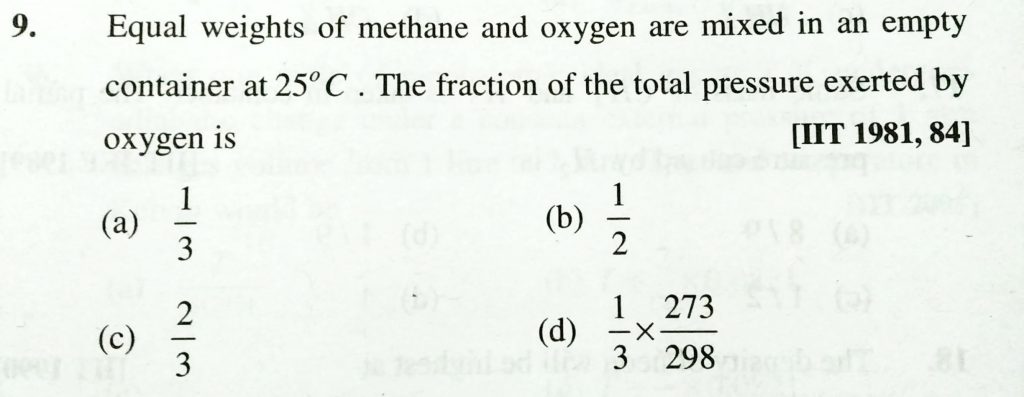 Equal weights of methane and oxygen are mixed in an empty container at 25 degee C . The fraction of the total pressure exerted by oxygen is (a) 1/3 (b) 1/2 (c) 2/3 (d) 1/3 x 273/298 Equal weights of methane and oxygen are mixed in an empty container at 25 degee C . The fraction of the total pressure exerted by oxygen is (a) 1/3 (b) 1/2 (c) 2/3 (d) 1/3 x 273/298 February 12, 2021 Category: Uncategorised (JEE Advanced Physics by BM Sharma + GMP Solutions) , Facebook Messenger WhatsApp Share this:TwitterFacebook Related