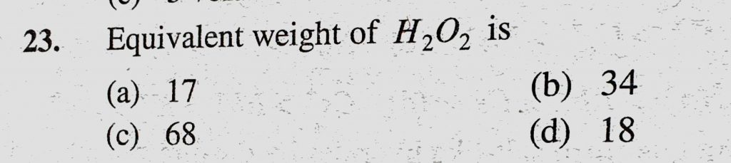 Equivalent weight of H2O2 is (a) 17 (b) 34 (c) 68 (d) 18 Equivalent weight of H2O2 is (a) 17 (b) 34 (c) 68 (d) 18 November 13, 2020 Category: Uncategorised (JEE Advanced Physics by BM Sharma + GMP Solutions) , Facebook Messenger WhatsApp Share this:TwitterFacebook Related