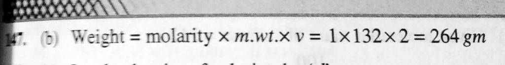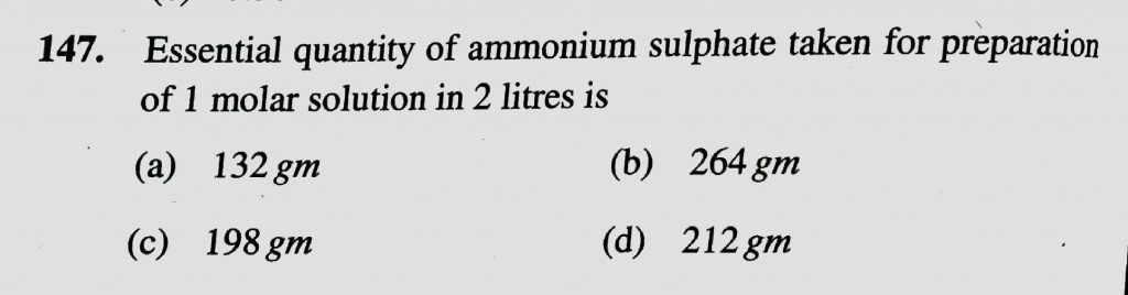 Essential quantity of ammonium sulphate taken for preparation of 1 molar solution in 2 litres is Essential quantity of ammonium sulphate taken for preparation of 1 molar solution in 2 litres is December 12, 2020 Category: Uncategorised (JEE Advanced Physics by BM Sharma + GMP Solutions) , Facebook Messenger WhatsApp Share this:TwitterFacebook Related