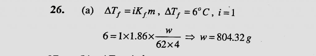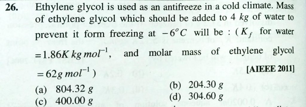 Ethlyene glycol is used as an antifreeze in a cold climate . Mass of ethylene glycol which should be added to 4 kg of water to prevent it from freezing at -6 degree C will be : Ethlyene glycol is used as an antifreeze in a cold climate . Mass of ethylene glycol which should be added to 4 kg of water to prevent it from freezing at -6 degree C will be : December 14, 2020 Category: Uncategorised (JEE Advanced Physics by BM Sharma + GMP Solutions) , Facebook Messenger WhatsApp Share this:TwitterFacebook Related